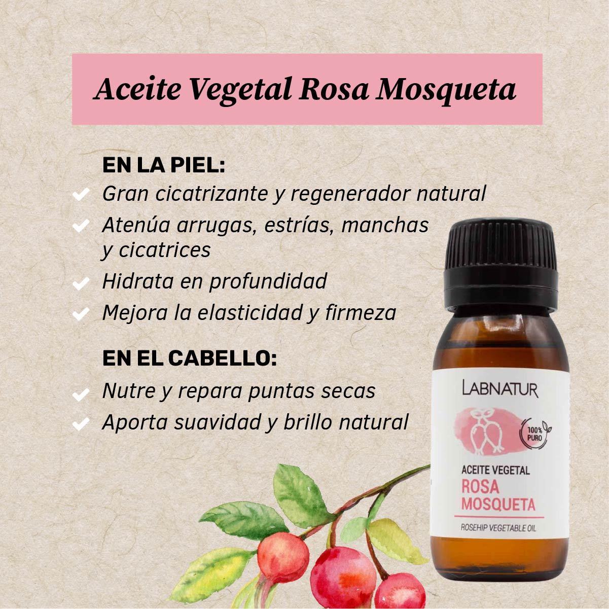 El Aceite Vegetal de Rosa Mosqueta de Labnatur aporta una gran cantidad de beneficios para la piel, gracias a sus propiedades hidratantes, regenerantes y cicatrizantes. La Rosa Mosqueta (también conocida como rosa eglanteria o rosa rubiginosa) es un aceite puro imprescindible para el cuidado de la piel. Tiene un gran poder para prevenir y tratar las cicatrices y estrías. También es muy eficaz para reducir las manchas de la piel y las marcas de acné.Además, promueve la síntesis de colágeno y ayuda a prevenir la aparición de arrugas y atenuar las más profundas. Actúa como epitelizante y reafirmante, aportando flexibilidad a la piel y mejorando su apariencia. Este aceite Vegetal de Rosa Mosqueta se obtiene por presión en frío de las semillas de un arbusto silvestre y tiene un alto contenido en ácidos grasos esenciales como el Omega 3, Omega 6 y el ácido linoleico. Gracias a estos ácidos, la Rosa Mosqueta favorece la hidratación natural y mejora la elasticidad de la piel, tonificando hasta las pieles más cansadas. Además, estos ácidos reparan la epidermis y mejoran la función barrera de la piel.También es eficaz en el cuidado del cabello gracias a sus propiedades regenerativas, consiguiendo un pelo más fuerte y brillante. Por todas estas propiedades, la Rosa Mosqueta es muy popular en productos y tratamientos de cosmética natural y se le conoce como el fruto de la eterna juventud.